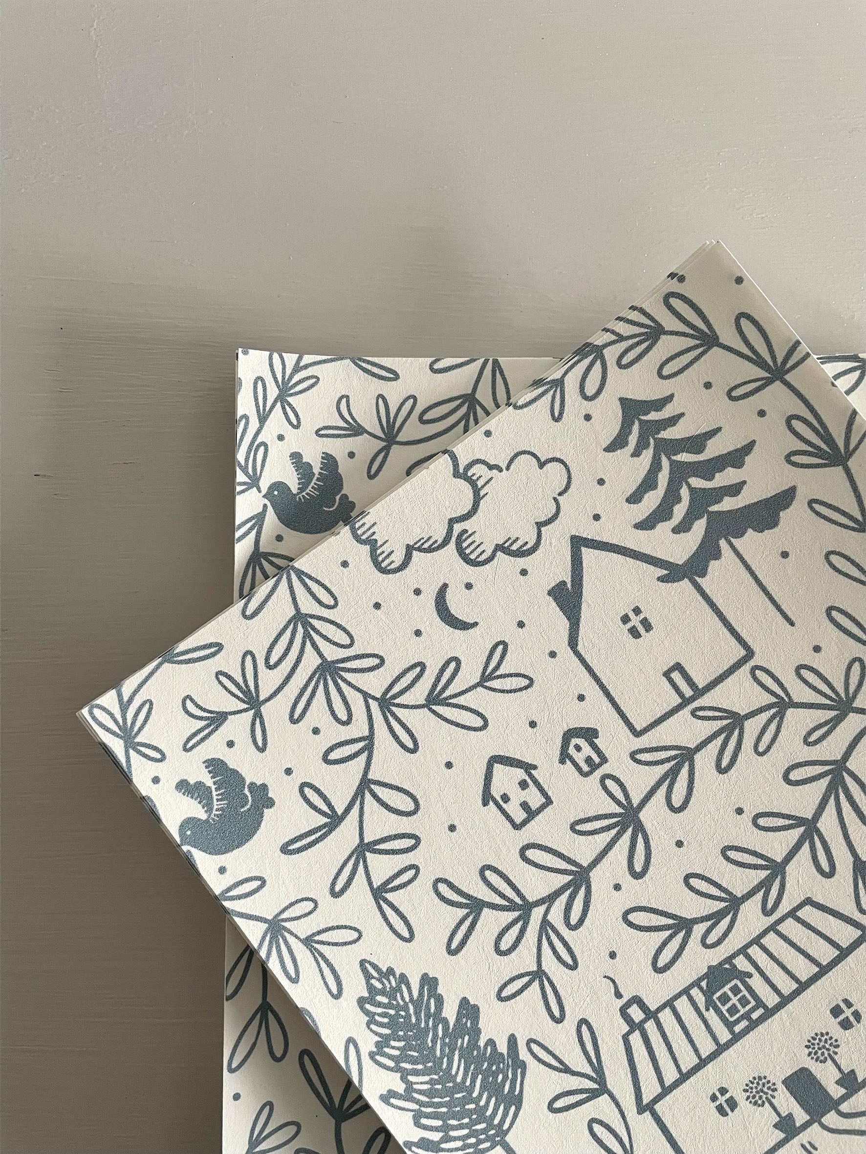 Cottages in the Woods Luxury Wallpaper is an intricate lineal hand illustrated design featuring whimsical cosy cottages surrounded by leafy foliage. Pairs beautifully with wall panelling. It also works as pretty cupboard or draw lining.