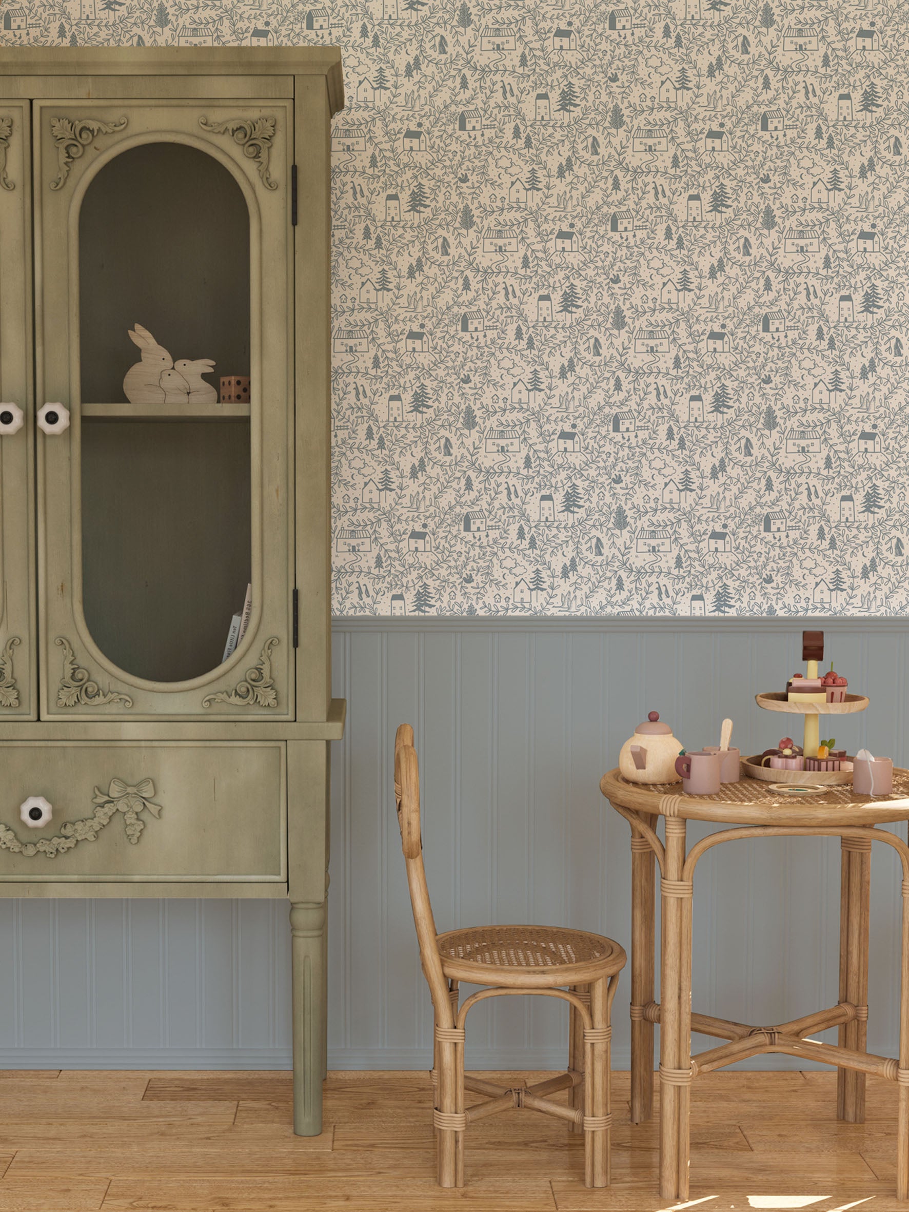 Cottages in the Woods Luxury Wallpaper is an intricate lineal hand illustrated design featuring whimsical cosy cottages surrounded by leafy foliage. Pairs beautifully with wall panelling. It also works as pretty cupboard or draw lining.