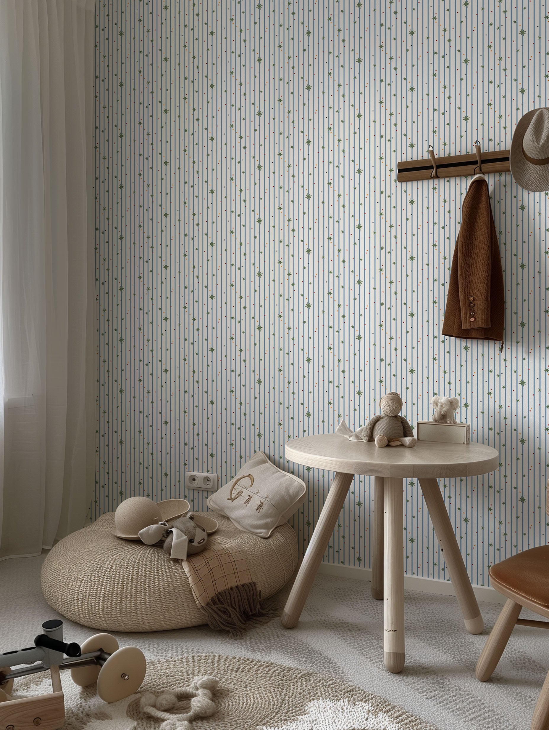 Add a playful sprinkle of magic to your child’s room with our Stars & Stripes wallpaper. Featuring charming stars on a trendy stripe background in a lively pattern, this design brings movement and joy to any space. Perfect for nurseries, playrooms, or bedrooms, it’s a versatile choice that sparks imagination while keeping walls fun and stylish.
